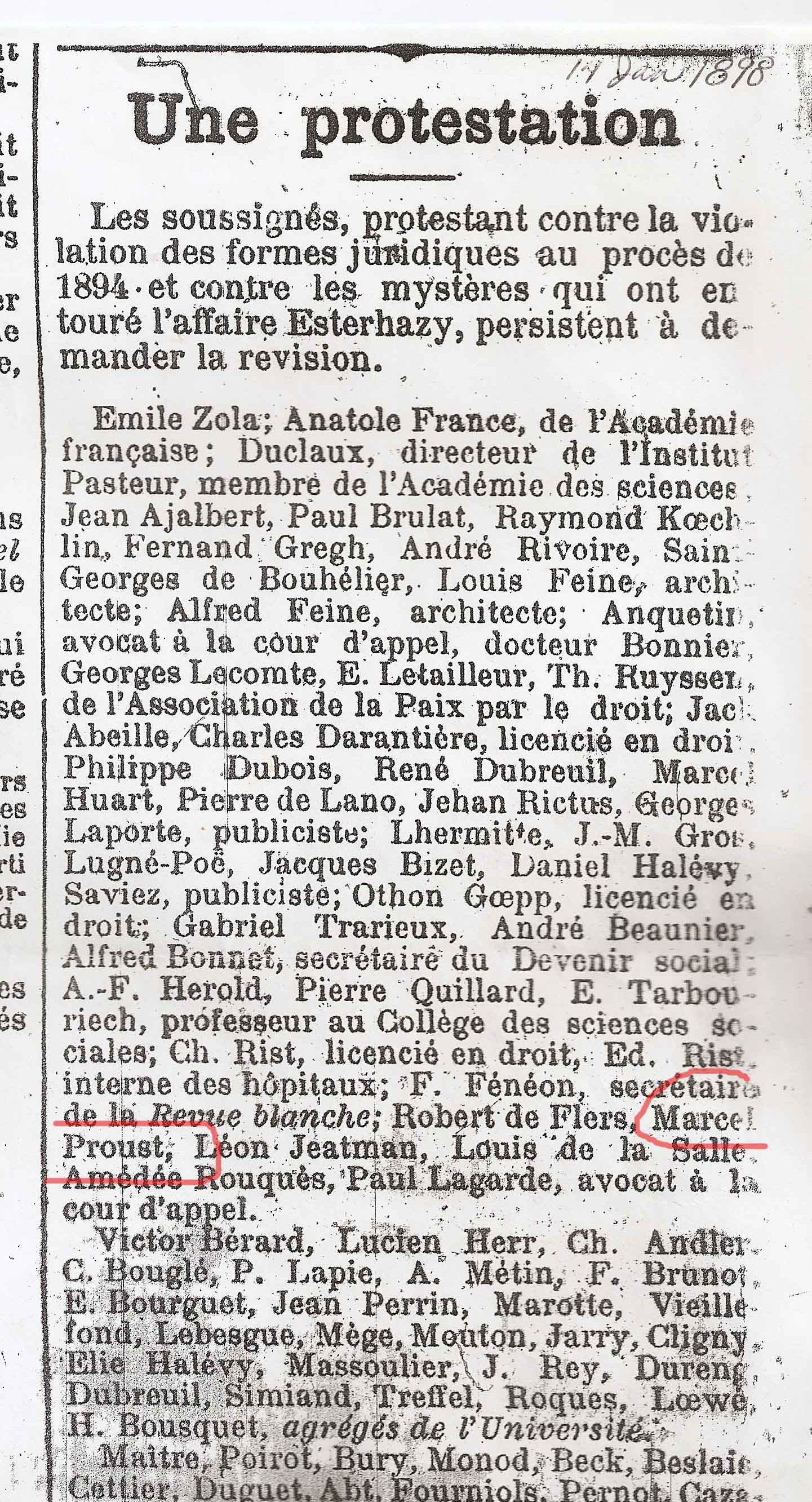 PS While reading for background, I learned that the entire notion of “the intellectual” is attributed categorically to the Dreyfus Affair. The day after Zola’s “J’Accuse” was published (Jan. 13, 1898) in Clemenceau’s newspaper (L’Aurore), a petition of protest was published there – soon called the “Manifesto of the Intellectuals.” Among its signatories was Marcel Proust. When Zola emerged from his role as prophet and became priest, he galvanized the academicians, writers, journalists to come forward en masse in protest – not so much against anti-semitism as against the lies and the corruption; he believed, unlike Norpois (the instrumentalist, the creature of diplomacy), that Truth and Justice are inextricably linked – and, therefore, Truth had come to light. I have read, but can’t now find the source, that Proust was a prime mover in the very process of drafting this courageous petition. An article in New York Review of Books (Sept. 20, 2001) called “Intellectuals and Tyrants: the Lure of Syracuse” by Mark Lilla refers to the birth of “the intellectual” within the Affair.