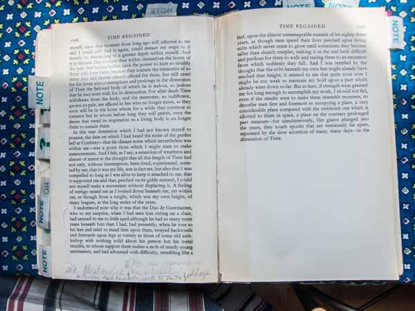 Is there a category for Proust’s hilarious technique of pasting snippets of one text onto an unrelated foundation story? Sometimes the snippet has a teeny modification. The result is a new high in color and humor. A fully blown demonstration of this technique (or form? – I don’t know what to call it) is the luncheon ceremony in the hotel dining room at Balbec on M’s second visit.